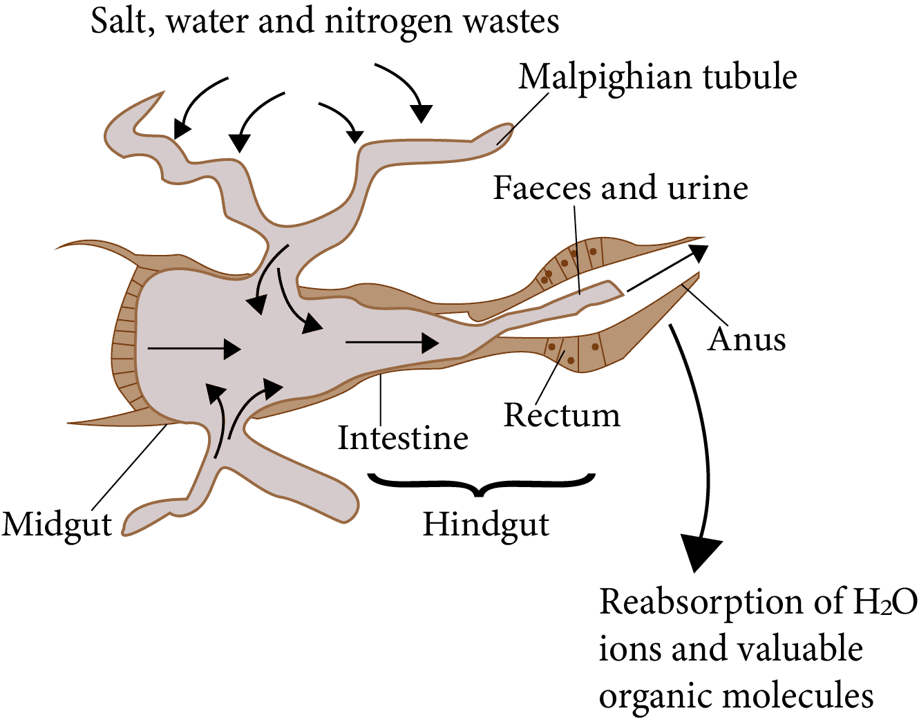 They digest nitrogenous waste and transform it into uric acid, which is removed from the body through the hindgut. Thus, this insect is referred to as uricotelic.
