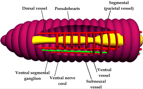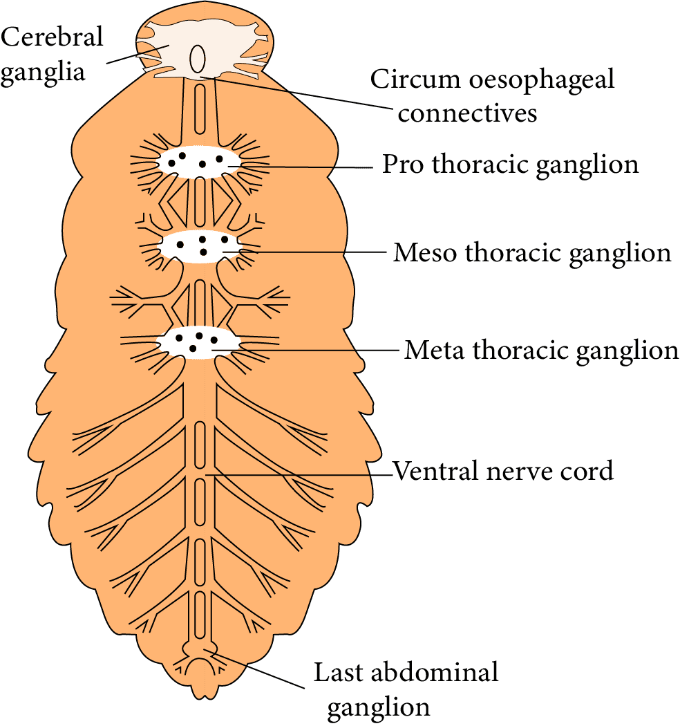 The nervous system is composed of ganglia. These ganglia are fused and segmentally organised. They are organised on the ventral side by paired vertical connectives.
