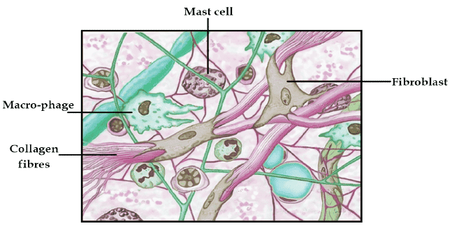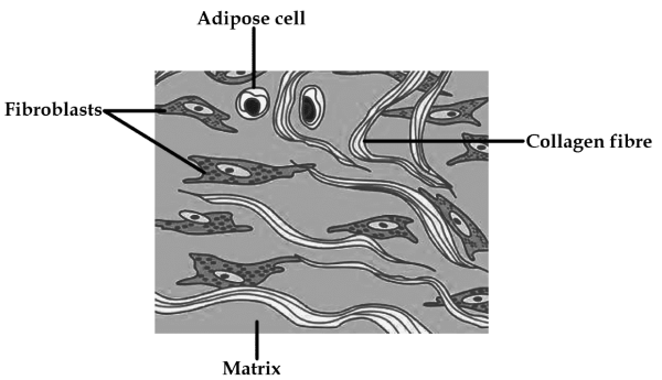 Fibroblasts produce and secrete two types of fibres: elastic yellow fibres and inelastic white fibres.