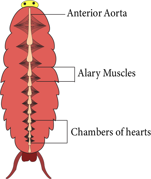 The heart is an enlarged muscular tube that extends along the thoracic and abdominal mid-dorsal lines. It consists of 13 funnel-shaped chambers. Ostia can be observed on both sides of the heart.