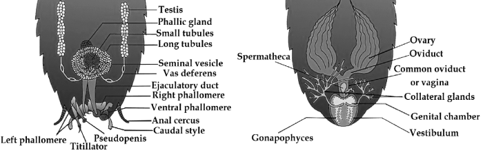Male Reproductive System: It consists of two testes, one on each lateral side between the fourth and sixth abdominal segments.