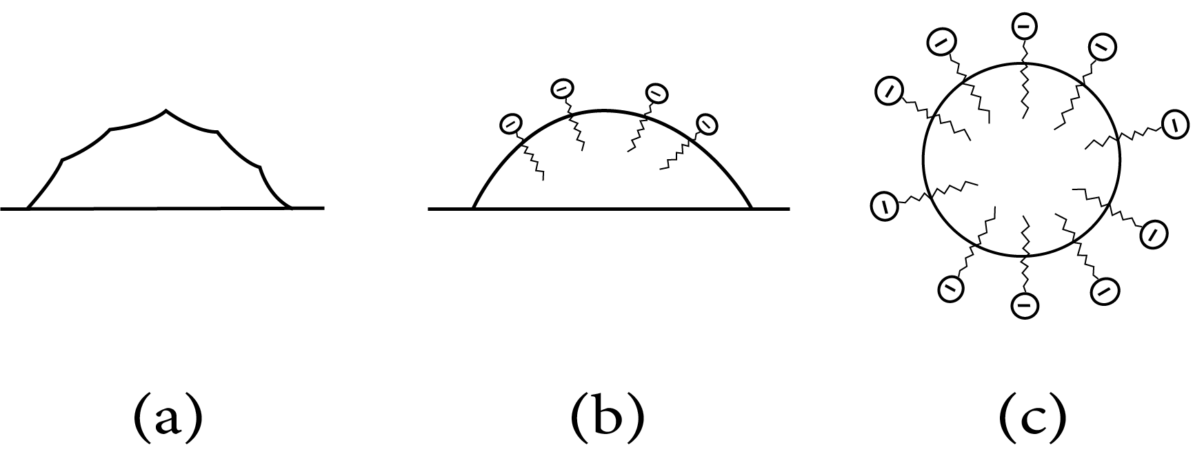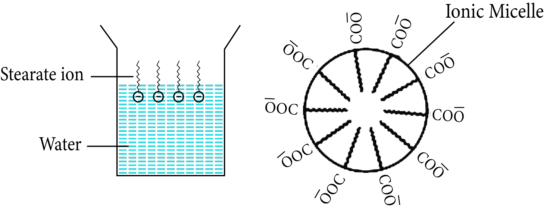As a result, the RCOO– ions are present on the surface with their COO–groups in water, while the hydrocarbon chains R remain at the surface. However, at crucial micelle concentrations, the anions are drawn into the solution's bulk and aggregate to form the micelle.
