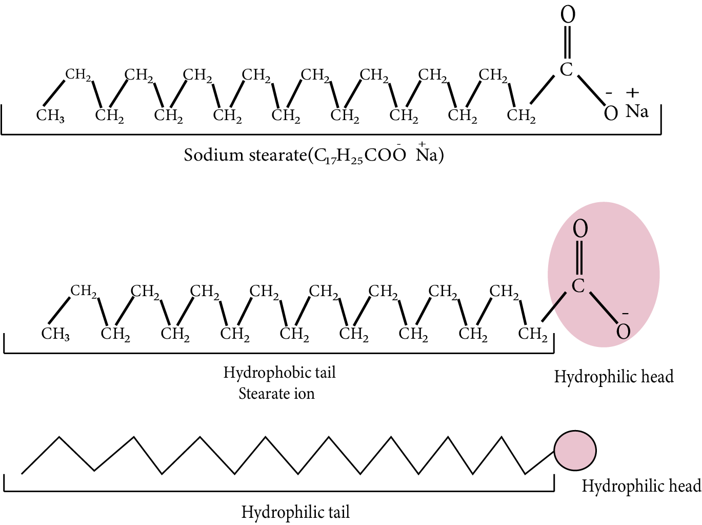 Soap is made up of sodium or potassium salt of a higher fatty acid as example- sodium stearate CH3 (CH2 )16COO–Na+ (e.g., sodium stearate CH3 (CH2 )16COO–Na+ , which is a key component of many bar soaps).It dissociates into RCOO– and Na+ ions when dissolved in water. The RCOO– ions, on the other hand, are made up of two parts: a hydrophobic (water repelling) long hydrocarbon chain R (also known as nonpolar 'tail') and a hydrophilic polar group COO– (also known as polar-ionic 'head') (water loving).