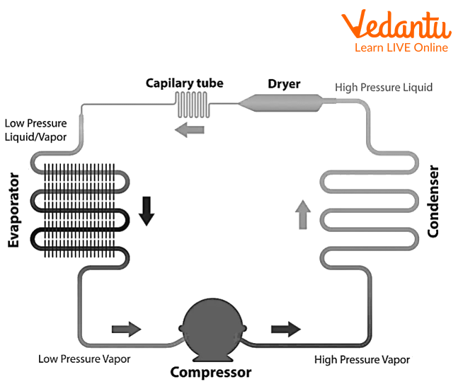 A household refrigerator operates on the vapour compression refrigeration cycle, which involves four main components:
