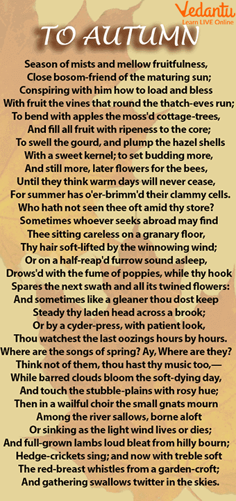 ‘To Autumn’ is a beautiful nature poem by one of the greatest romantic poets of English literature, John Keats. This poem teaches its readers to appreciate nature’s beauty and abundance. The changing seasons reflect the transience and maturing of humans from childhood to old age and finally death. To read and learn about similar poems, head over to our website today!