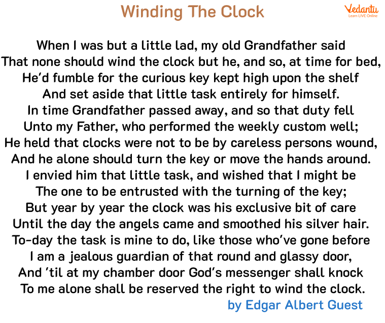 Summary: The poem is written by Edgar Albert Guest. It is a simple poem that runs through the timeline of the poet's entire life – from when he was a lad to when he died. The poet had a tradition in his home of winding an ancestral clock, which is mentioned in the poem for over three generations. First, his grandfather had the responsibility and then his father. All this time, the poet would be too envious of the two as he wanted to look after the clock. Finally, when his father also died, the poet took the responsibility of being the guardian of the round clock and served it till he died.