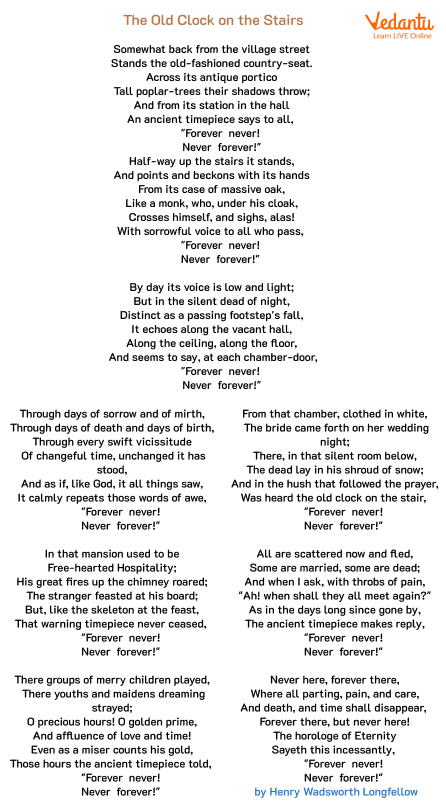 Summary: Henry Wadsworth Longfellow’s long poem contains repetition to highlight the personification of the clock. It conveys the idea of humans' relationship to time. The refrain "Forever — never! Never — forever!" focuses on the famous quote: time stops for nobody. With each stanza set in a different background story with different emotions, the poem reminds us that no one can escape the cycle of time.