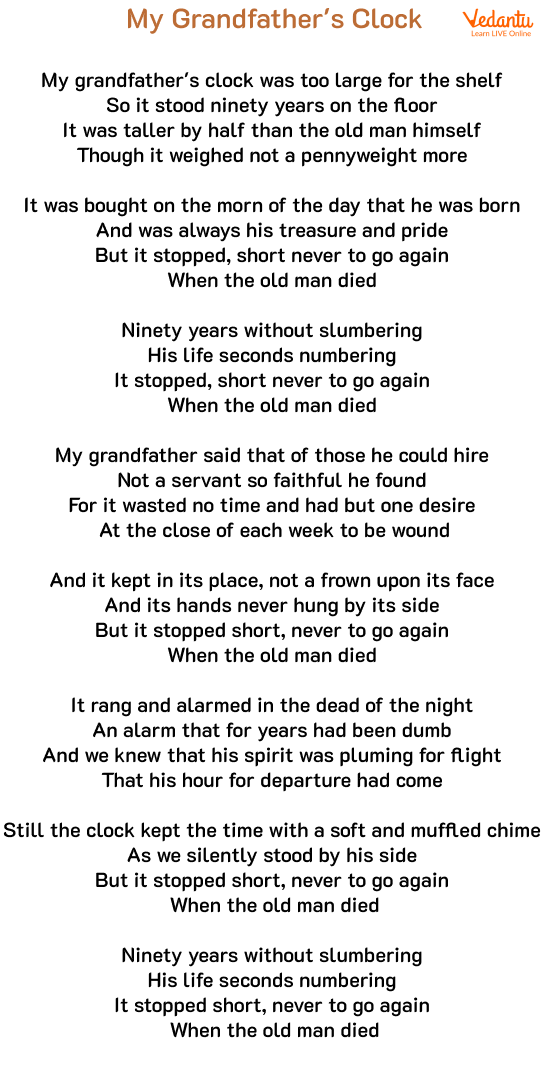 Summary: It is a classic song written by Henry Clay Work in 1876. The grandfather clock got its name from this poem. The poem mildly discusses death with children. It narrates a story about a grandfather's clock from a grandchild's point of view. The clock was purchased when the grandfather was born, and after enduring 90 years, it suddenly stopped forever when the grandfather died. The clock was required to be wound at the end of each week. In this poem, the clock seems to share the grief and joy of grandfather, as it rang 24 chimes when the grandfather brought his bride for the first time and suddenly stopped to never work again when the old man died.