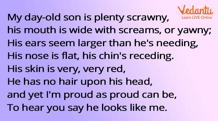 Parental Pride is one of the most beautiful poems composed by Richard Armour. This poem expresses the love of a father for his newborn baby boy. Yet he is only one day old, he said that the little one looks like him. Though he makes fun of him, feel proud to say that he is a copy of his father.