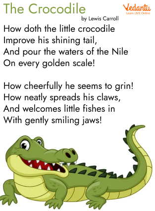 'The Crocodile' is a delightful and brief poem. It was first published in Lewis Carroll's work Alice's Adventures in Wonderland in 1865, and is also known as 'How Doth the Little Crocodile.' In chapter two, Alice reads a poem. This poem came to her thoughts as she was trying to remember another, Isaac Watts' 'Against Idleness and Mischief.'