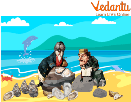 The drive-home point in the sea is very wet, and the sand is parched. The whole sky was devoid of only two elements and they are the clouds and the birds. The main character makes their entry. The walrus and carpenter are seen walking together sad and shedding tears on the shore of the sea. The walrus thinks that the seven brooms for six months would be able to clear all the sand. Walrus spots a colony of oysters and invites them to walk with him and the carpenter. The walrus then limits the oysters to four, each of their hands is able to hold hands with one oyster.