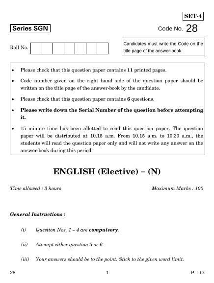 English Elective Question Paper for CBSE Class 12 - 2018 - Free PDF Download