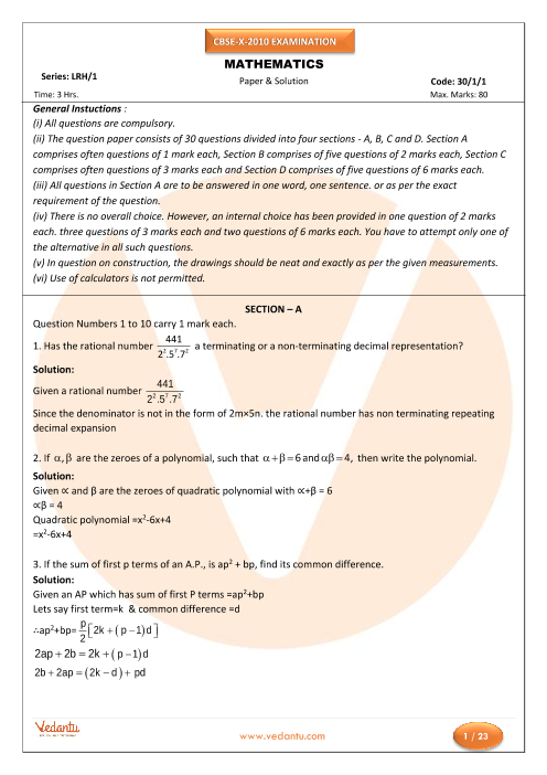 Previous Year Question Paper for CBSE Class 10 Maths - 2010 - Free PDF Download