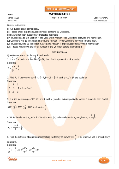 CBSE Class 12 Maths Board Exam Question Paper for 2015 - Free PDF Download