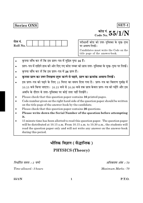 CBSE Class 12 Physics Previous Year Question Paper with solution - 2016 Set 1 N - Free PDF Download