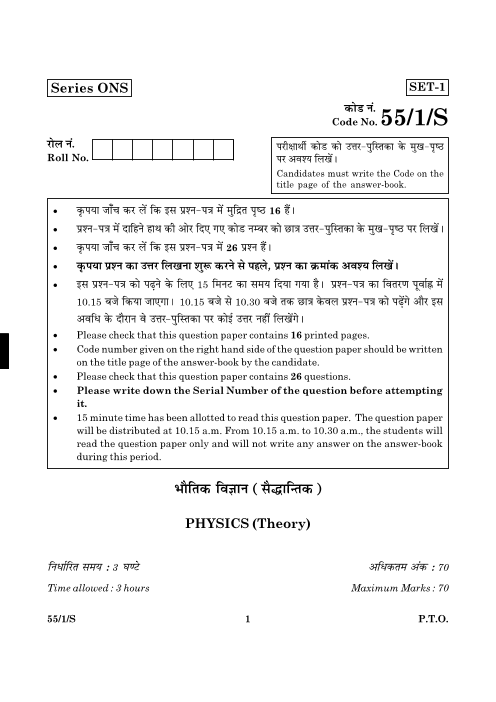 CBSE Class 12 Physics Previous Year Question Paper with Solutions - 2016 Set 1 S - Free PDF Download