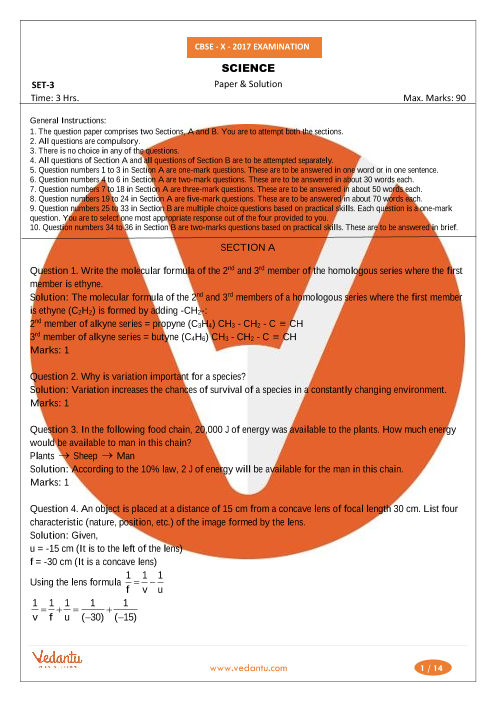 Step 1 – Download a free PDF of the Previous Year Science Question Paper for CBSE Class 10 – 2017 from Vedantu