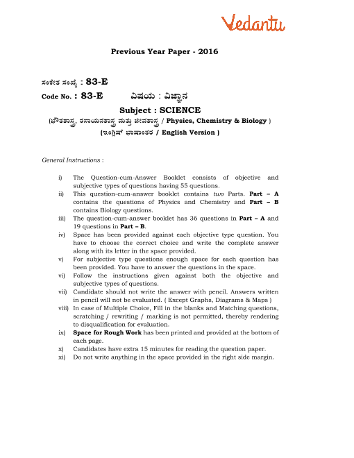KSEEB SSLC Science Question Paper for Class 10 2016 is provided on the Vedantu website, India's leading learning platform. They provide information in the form of a question-and-answer booklet, which may be downloaded for free without any problems. This solution has been prepared by Vedantu's qualified lecturers. This solution is written with the learner's level in mind, allowing the student to understand it quickly.