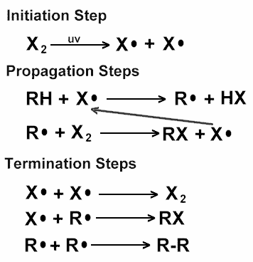 First, let’s see the mechanism of Chemical reaction involved in the Halogenation of alkane -