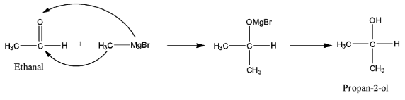When this reacts with the carbonyl group then there will be the addition of an alkyl group at the carbon atom having the oxygen atom. Now, when the ethanal reacts with methyl magnesium bromide, then the methyl group will attack the carbon atom having the carbonyl group, while the MgBr will attack the Oxygen atom.