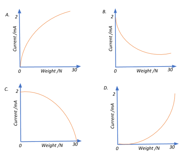 Thus we see that the slope is increasing per weight, which also means that there is no current flow when no weight is applied. Therefore, the correct choice would be the graph A.
