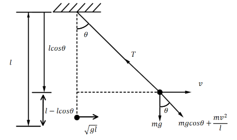 \[mg = mg\cos \theta + \dfrac{{m{v^2}}}{l}\]….(i)