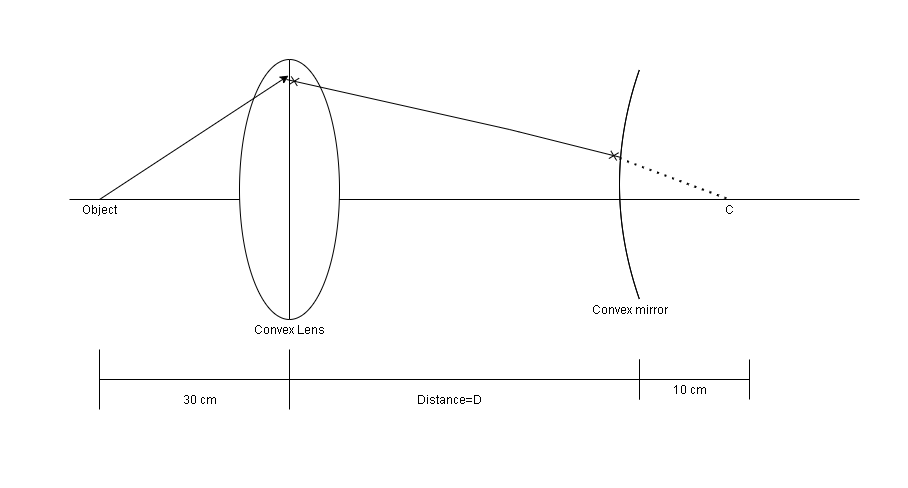 A luminous object is placed at a distance of 30 cm from the convex lens of focal length 20 cm. On the other side of the lens, at what distance from the lens a convex mirror of radius of curvature 10 cm be placed in order to have an upright image of the object coincident with it?