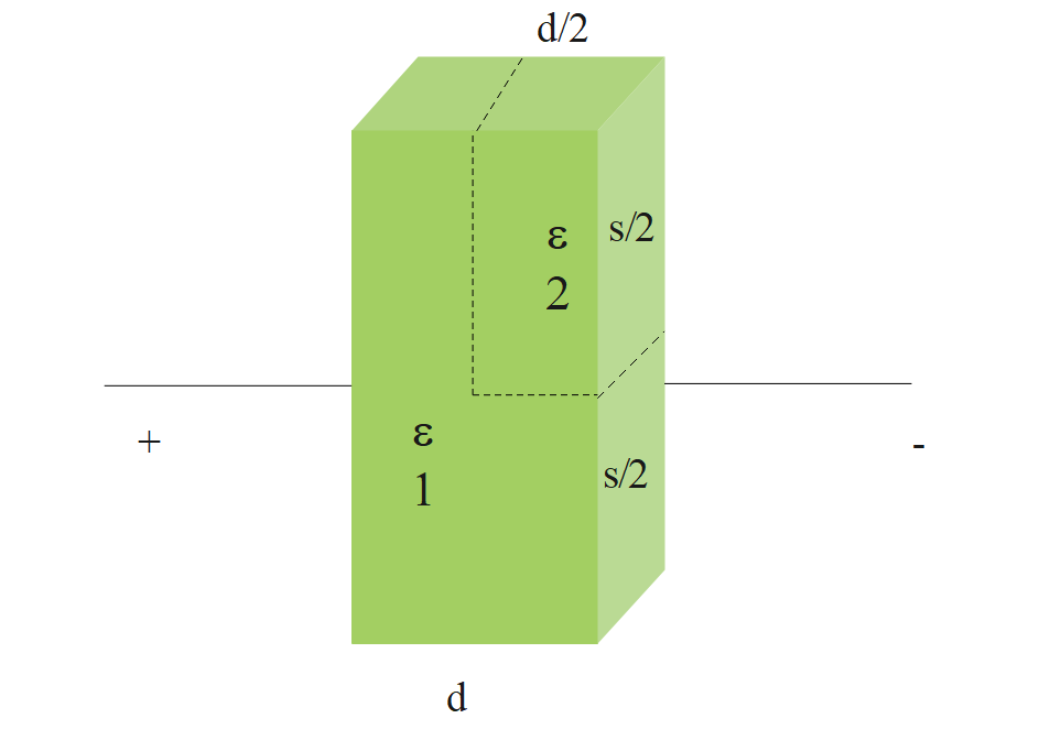 A parallel plate capacitor having plates of area S and plate separation d, has capacitance $C_1$ in air. When two dielectrics of different relative permittivity $({{\varepsilon }_{1}}=2,{{\varepsilon }_{2}}=4)$ are introduced between the two plates as shown in the figure, the capacitance become $C_2$. The ratio $\dfrac{{{C}_{2}}}{{{C}_{1}}}$ is.