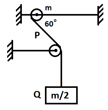 A smooth ring P of mass $m$ can slide on a fixed horizontal rod. A string tied to the ring passes over a fixed pulley and carries a block Q of mass $\dfrac{m}{2}$ as shown in the figure. At an instant, the string between the ring and the pulley makes an angle ${{60}^{\circ }}$ with the rod.
