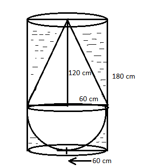 Required volume of water left in the cylinder = Volume of cylinder - Volume of solid $ = \pi {\left( {60} \right)^3}\left[ {3 - \dfrac{4}{3}} \right] $