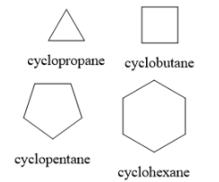Cycloalkanes are hydrocarbons containing carbon and hydrogen atoms. They contain all single bonds. They contain one (or more) ring of carbon atoms. Cyclopropane, cyclobutane, cyclopentane and cyclohexane contain 3,4,5, and 6 carbon atoms respectively. The structures of cycloalkanes are shown below: