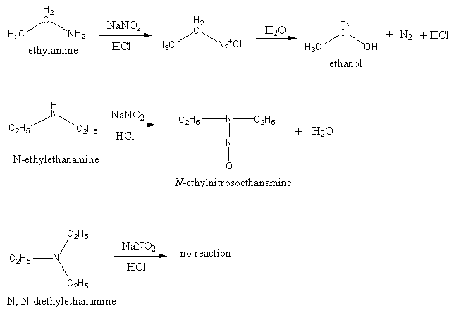 What is the action of sodium nitrate and hydrochloric acid on ethanamine, N-ethylethanamine and N, N-diethylethanamine?