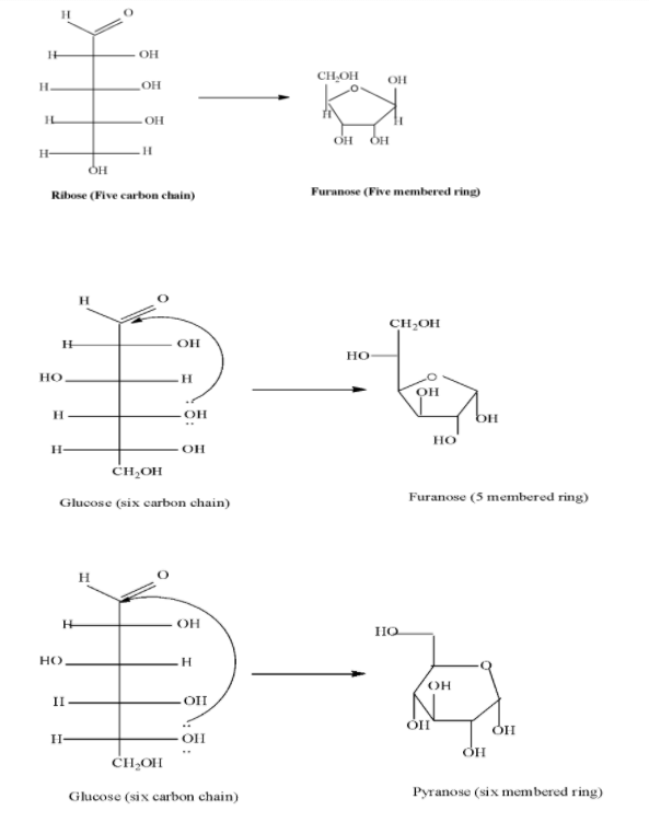 Hint: Monosaccharides having five and six carbon are glucose and ribose and they can form both cyclic as well open chain structure. Furanose structure is shown by ribose ring like structure and glucose can show both pyranose (six membered ring) as well as furanose (five membered ring)structure.