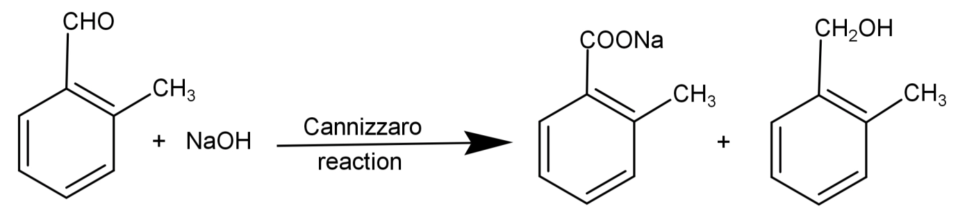 $2R - CHO\xrightarrow[{{H_3}{O^ + }}]{{NaOH}}R - C{H_2}OH + R - COOH$
