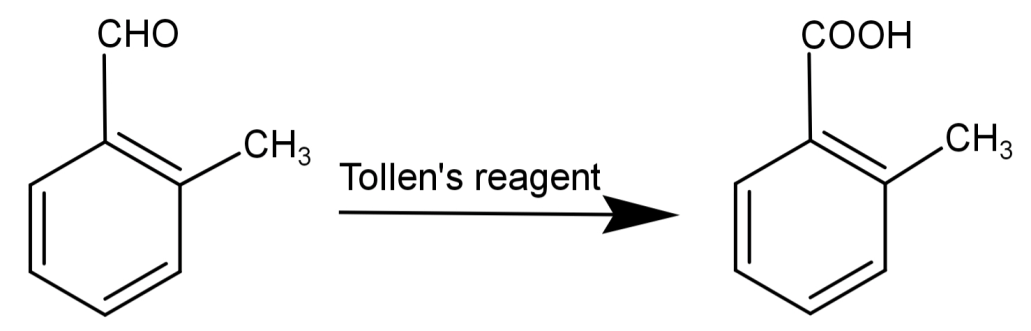 Tollen’s reagent is a solution of: silver nitrate ($AgN{O_3}$) and ammonia ($N{H_3}$) and is used for the detection of aldehydes. This reagent converts aldehydes to carboxylic acids. The general form of reaction by Tollen’s reagent is: