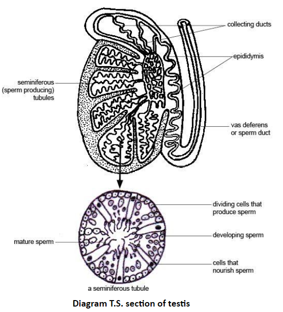 Note: They are found in the lower abdomen and within the scrotal sac –it is because the temperature which the sperm requires to sustain is lower than that of the body temperature. Testosterone is responsible for male genital growth and the production of sperm.