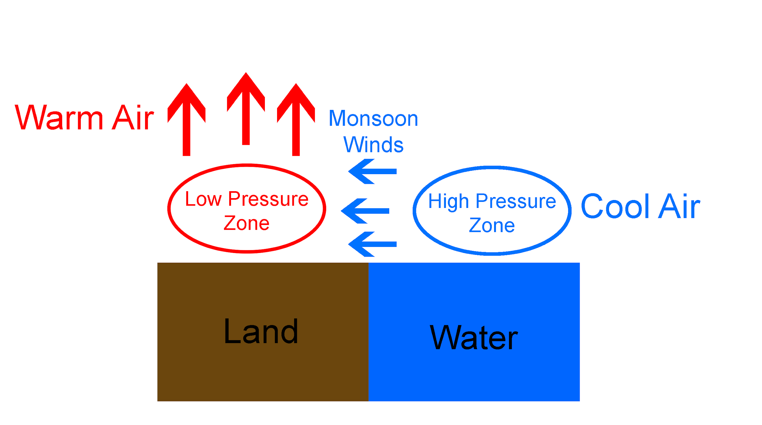 We know that hot air rises and cold air does not. So the hot air above the land will rise but the air above the oceans will not. This will lead to the formation of a low pressure zone above the land. We know that air moves from high-pressure zones to low-pressure zones, so the air above the ocean which is a relatively high-pressure zone will rush towards the land. This rush of air will have a lot of moisture which will bring rain and hence monsoon.