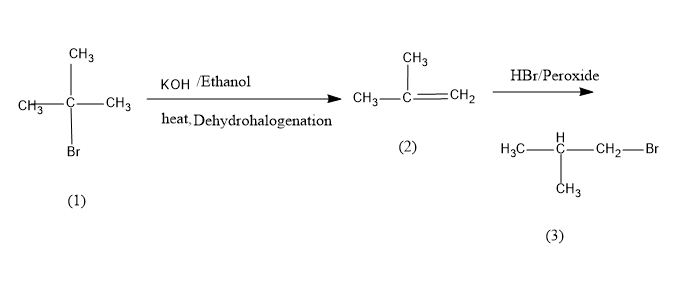 Tert-Butyl bromide is converted into isobutene on dehydrohalogenation which on bromination in presence of peroxide yields iso-butyl bromide or 1-bromo-2-methylpropane,