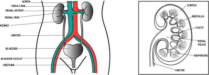 Kidney: The kidney is the main organ of the urinary system. Kidneys are the place where all the filtration occurs. They contain millions of nephrons which are the functional unit of the urinary system. All the fluid from the intestines gets sent to this organ to be processed. After the waste is removed they are then sent to the urinary bladder.