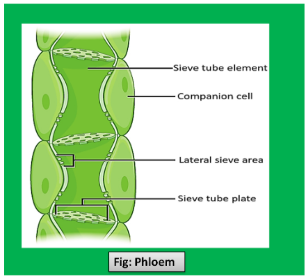 Companion cells: narrow, elongated, thin-walled living cells which lie beside the sieve tubes. Their close companionship is maintained by plasmodesmata. Its nuclei control the activities of sieve cells also. Phloem Parenchyma: They are living and elongated parenchymatous cells which store food, resins, latex etc. It has abundant plasmodesmata for lateral conduction of food.
