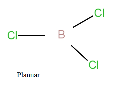 The 2s and 2p orbital will hybridise giving $s{p^2}$ hybrid orbitals that will form bonds with chlorine atoms. The boron with $s{p^2}$ hybridisation has three bond pairs and no lone pair. So, these three bond pairs form planar structure with ${120^0}$ bond angle.