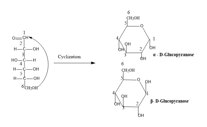 When the glucose is present in aqueous state almost every glucose molecule will be in cyclic structure and cyclic structure of the glucose is obtained by the cyclization reaction of the open chain structure enhanced by the nucleophile addition between the -OH group in the C-5 and aldehyde group in C-1. Here –OH group is the nucleophile and the cyclisation yields a hemiacetal group, -C-(OH)-H-O at C-1 and this ring is referred to as pyranose.