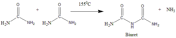 The chemical equation for biuret can be given as follows. In here two molecules of urea on heating releases ammonia gas and gives white crystalline solid of biuret.