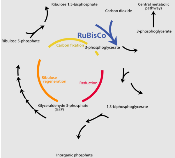 1) Carbon fixation or carboxylation: In this process, the \[CO_2\] is fixed into a stable organic intermediate. The carboxylation of RuBP takes place by the help of \[CO_2\]. This reaction is catalysed by the enzyme RuBisCO to form two molecules of 3-PGA.