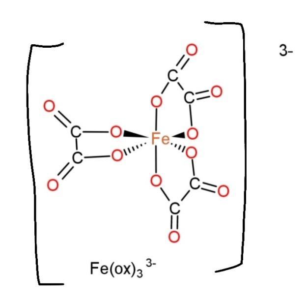 ${{[Fe{{(ox)}_{3}}]}^{3-}}$, contain oxalate as a ligand, with denticity 3, and it bind though two atoms, so the structure become,