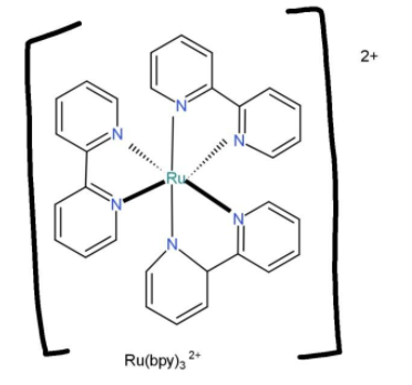 ${{[Ru{{(bpy)}_{3}}]}^{2+}}$, contains bipyridine as ligand with denticity of 3, this can bind through both of their nitrogens to for the structure,
