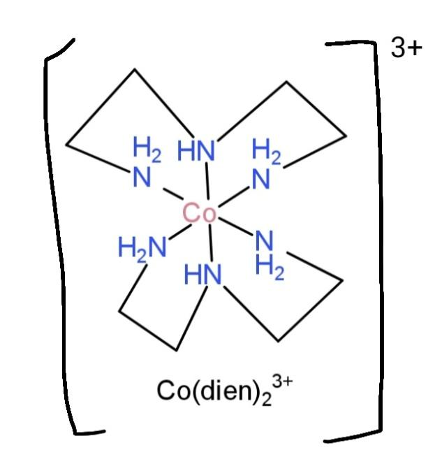 ${{[Co{{(dien)}_{2}}]}^{3+}}$, contains diethylenetriamine as ligand, with denticity of 2, and this binds with the central atom as,