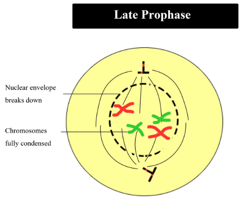 Condensation of chromosomes is completed in the late prophase because by the end of prophase the chromosomes arrange themselves for movement which may cause chromosomes to entangle and break if not condensed. The chromosomes during the middle prophase get shortened and thickened and obtain their specific shape and size. During the late prophase, the nuclear membrane and the nucleolus finally vanish completely. The chromosomes then become quite distinct and can be easily differentiated from each other. At opposite ends of the cells centrioles and asters are present while the protein spindles attach to the each chromosomal centromeres from opposite directions. The mitotic spindle during the late prophases starts to arrange the chromosomes and the chromosomes are released by breaking off the nuclear envelope. The mitotic spindle grows more, and some of the microtubules start to chromosomes.