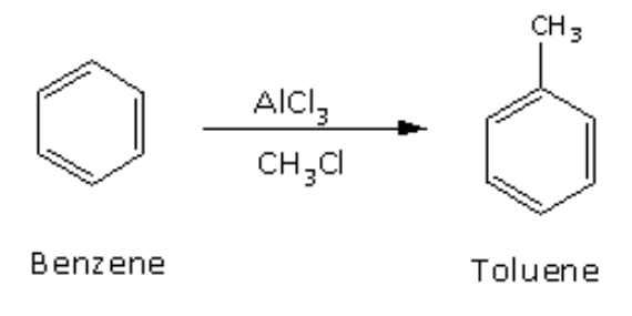 Here, aluminum chloride acts as a catalyst which increases the rate of the reaction and facilitates the conversion of benzene to toluene.