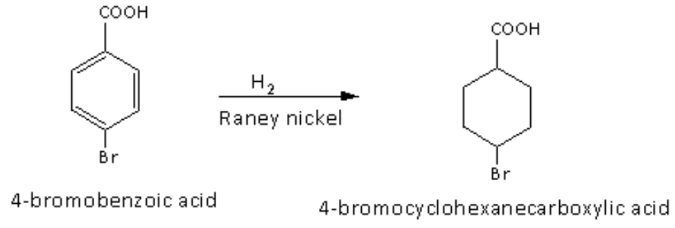 4-bromobenzoic acid in reaction with Raney nickel gives 4-bromocyclohexanecarboxylic acid. Here, the role of the Raney nickel is hydrogenation that is the addition of the hydrogen across the double bonds of the benzene and form cyclohexane.